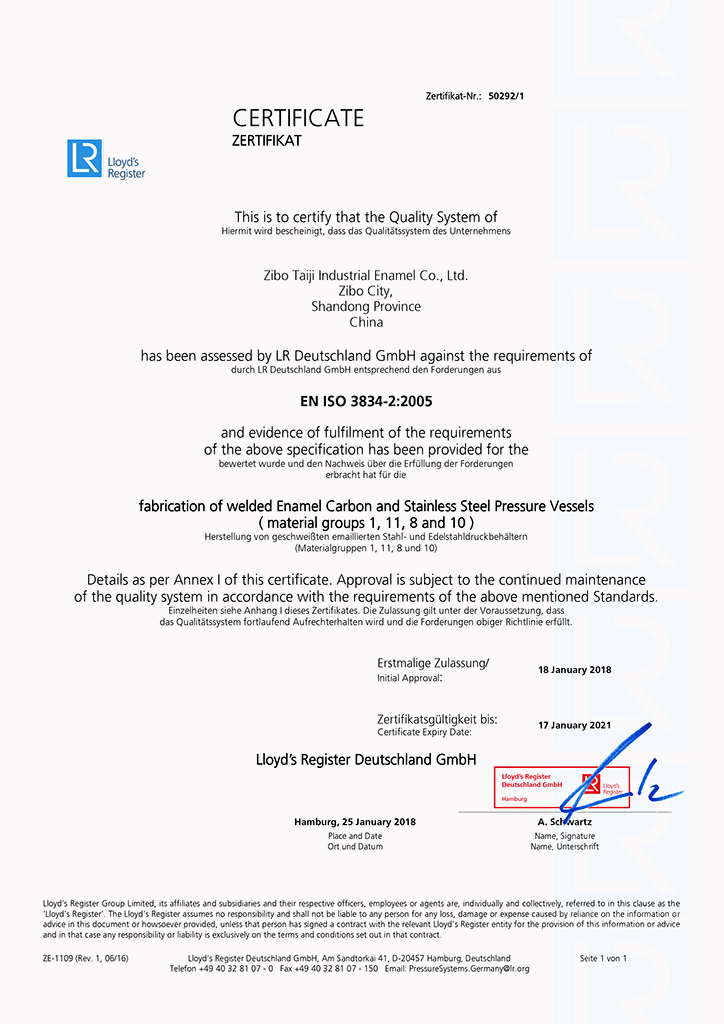 淄博太極在中國搪玻璃設備制造行業中首家通過ISO90001質量體系認證,并擁有美國ASME認證、歐洲PED認證以及國家部門頒發(fā)的搪玻璃制造許可證、進出口許可證和百余項榮譽證以及三十六項專利等。